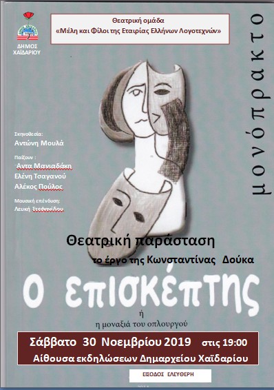 Ο Δήμος Χαϊδαρίου και η Θεατρική Ομάδα «Μέλη και Φίλοι της Εταιρίας Ελλήνων Λογοτεχνών» σας προσκαλούν στην θεατρική παράσταση του έργου της Κατερίνας Δούκα «Ο Επισκέπτης».