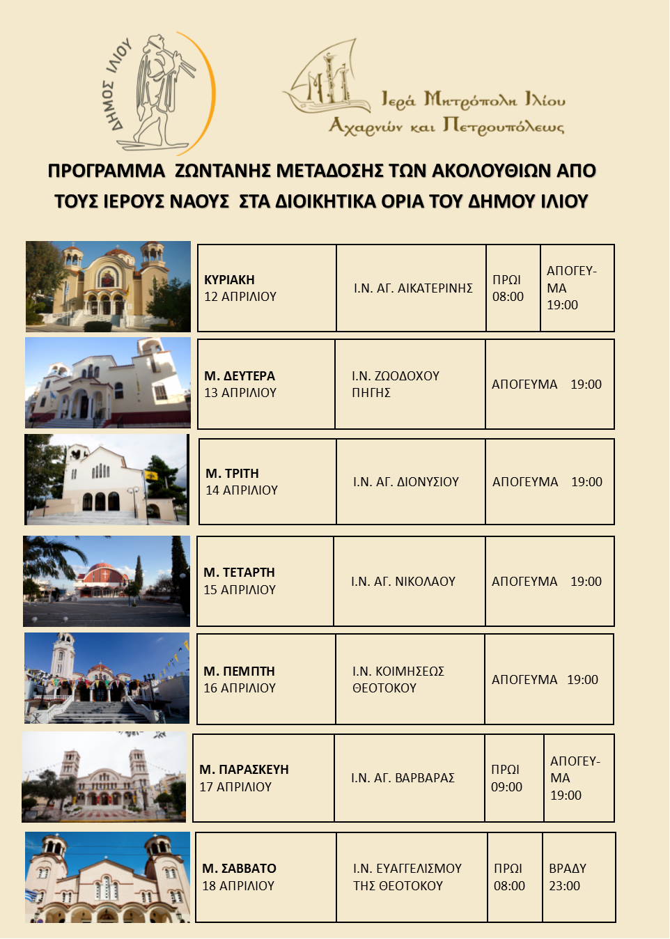 Οι μεταδόσεις θα ξεκινήσουν από την Κυριακή 12 Απριλίου 2020 και θα πραγματοποιούνται, μέσω της ιστοσελίδας www.ilion.gr, με την τεχνική υποστήριξη της HELLASNEWS TV, κάθε μέρα από διαφορετικό Ναό, προκειμένου να δοθεί η δυνατότητα στους πιστούς να τις παρακολουθήσουν ζωντανά από την ενορία τους.