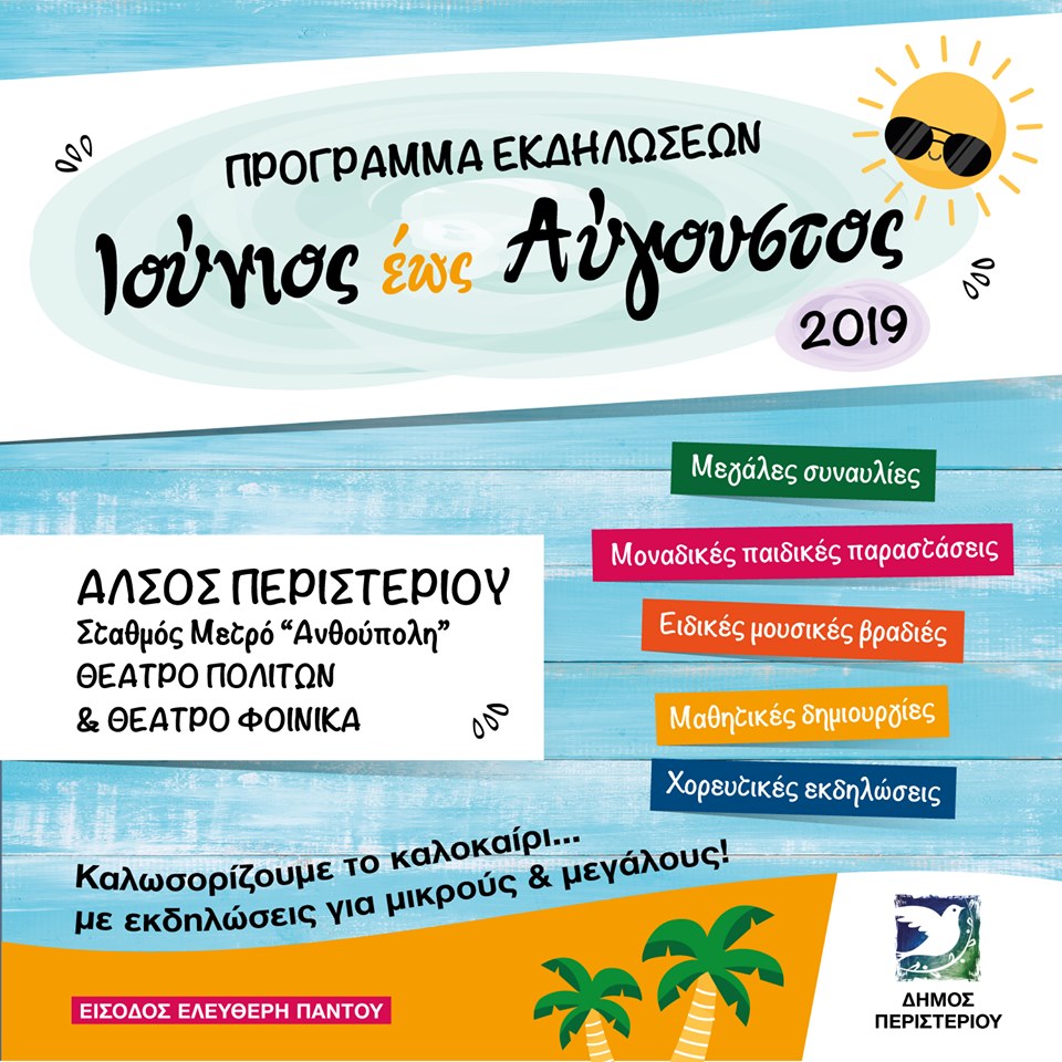 Στο πλαίσιο των καλοκαιρινών εκδηλώσεων του Δήμου Περιστερίου διοργανώνονται μεγάλες συναυλίες, μοναδικές παιδικές παραστάσεις, ειδικές μουσικές βραδιές, χορευτικές εκδηλώσεις και μαθητικές δημιουργίες για τους μήνες Ιουνίου, Ιουλίου και Αυγούστου 2019, στο Άλσος Περιστερίου και στα Θέατρα Φοίνικα και Πολιτών. Είσοδος Ελεύθερη Παντού!