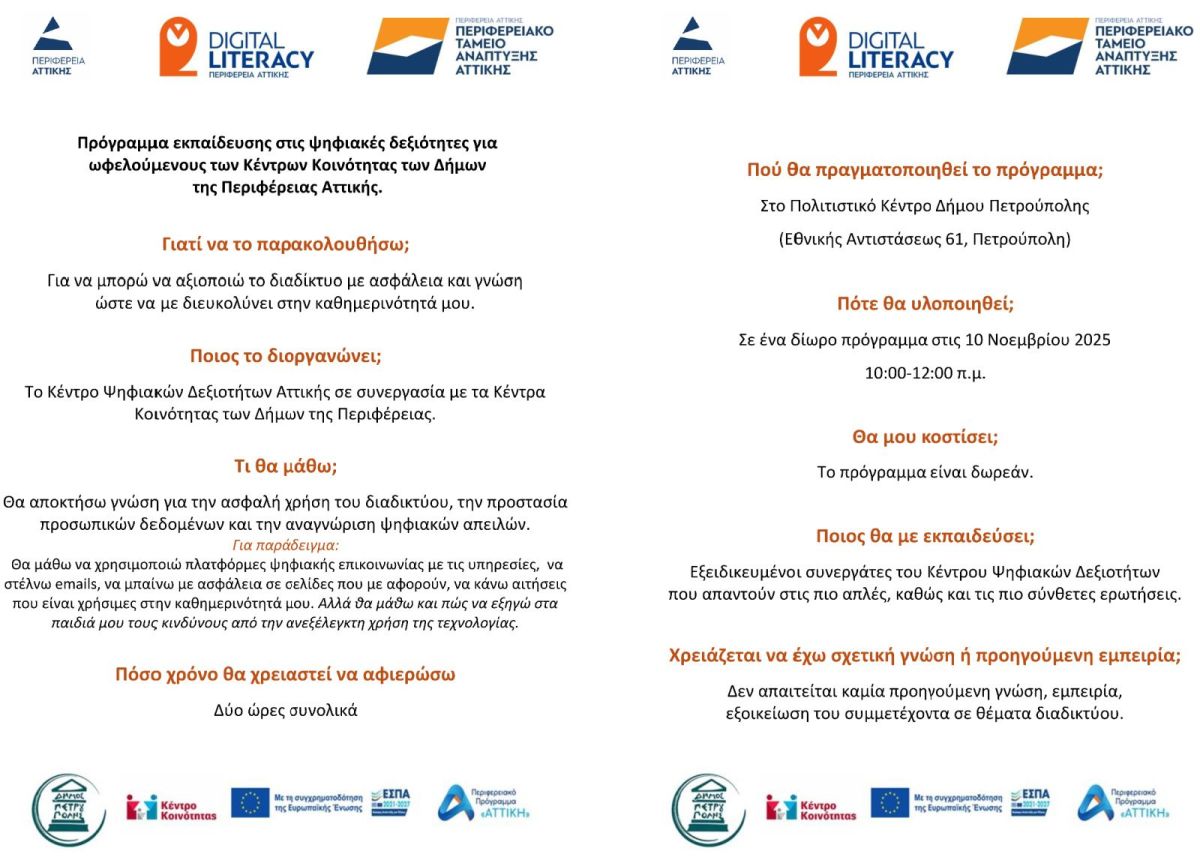 Το Κέντρο Ψηφιακών Δεξιοτήτων Αττικής, σε συνεργασία με τα Κέντρα Κοινότητας των Δήμων της Περιφέρειας Αττικής, διοργανώνει ένα δωρεάν εκπαιδευτικό πρόγραμμα με στόχο την ενδυνάμωση των πολιτών σε βασικές ψηφιακές δεξιότητες.