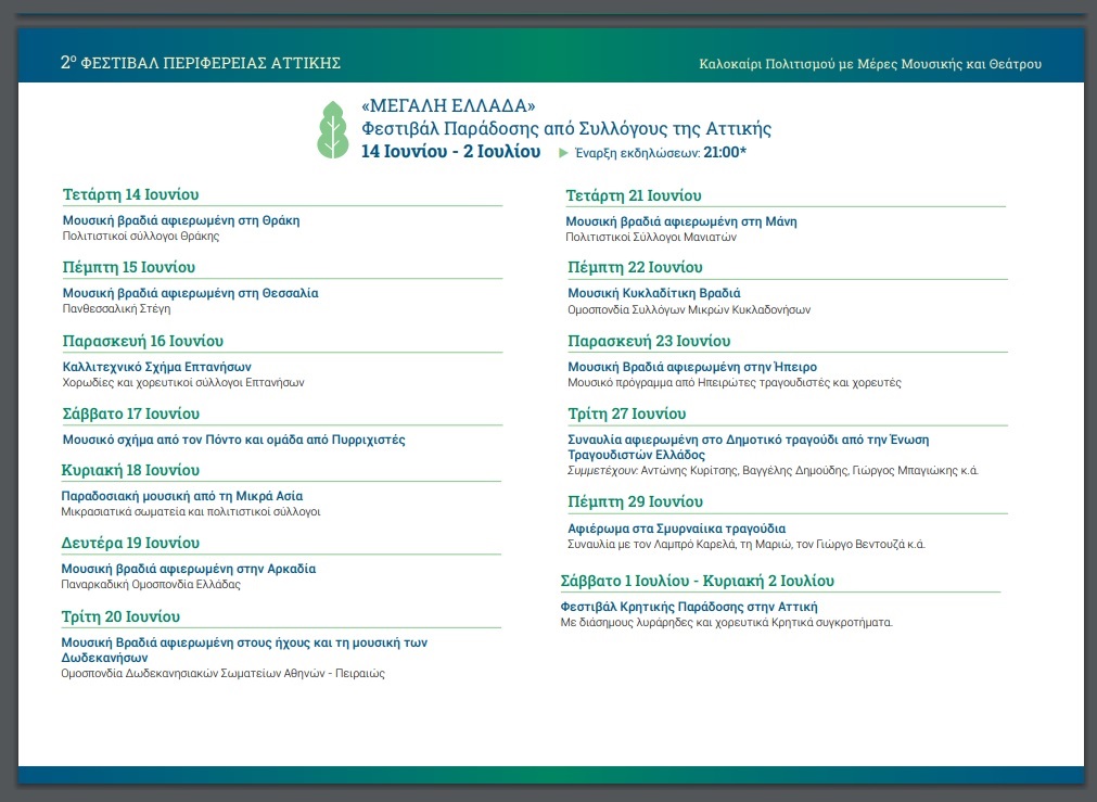 Να σημειωθεί ότι στο πλαίσιο του2ου Πολιτιστικού Φεστιβάλ της Περιφέρειας Αττικής «Καλοκαίρι Πολιτισμού με μέρες μουσικής και θεάτρου», οι παραστάσεις θα συνεχιστούν μέχρι τις 4 Αυγούστου με πλούσιο πολιτιστικό πρόγραμμα.