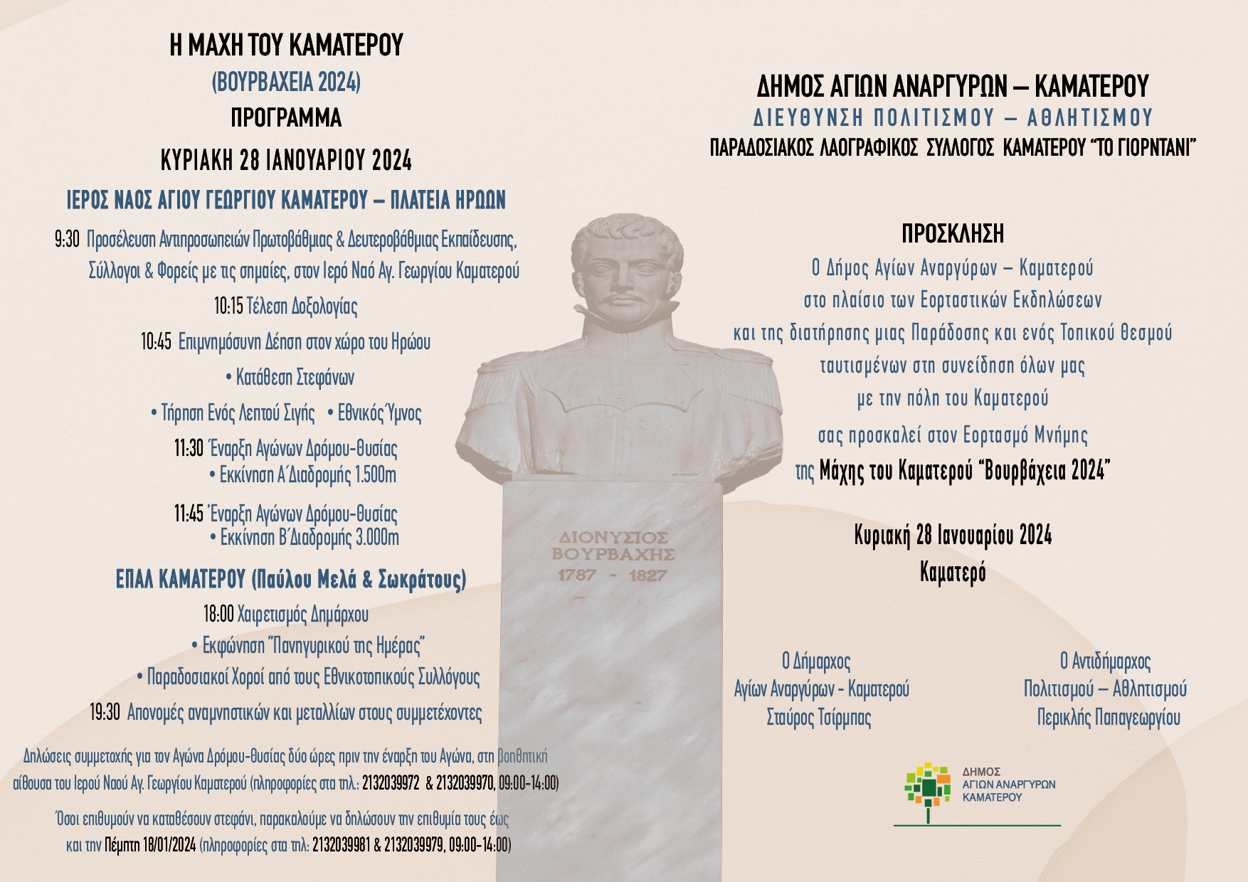 Άγιοι Ανάργυροι: Εκδήλωση για τον εορτασμό των Βουρβαχείων 2024 (Μάχη του Καματερού) Από life 0 Σχόλιοs Εκδηλώσεις για την επέτειο της Μάχης του Καματερού στον δήμο Αγίων Αναργύρων. Δείτε παρακάτω την πρόσκληση και το πρόγραμμα: Πολιτιστικά Συντάκτης Δημοσιογραφική ομάδα LIFE
