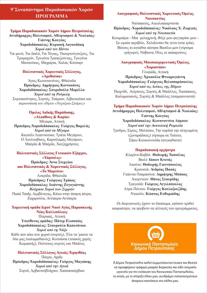 Στο «9ο Συναπάντημα Παραδοσιακών Χορών», εκτός από το τμήμα Παραδοσιακών Χορών του Δήμου Πετρούπολης, θα συμμετέχουν: