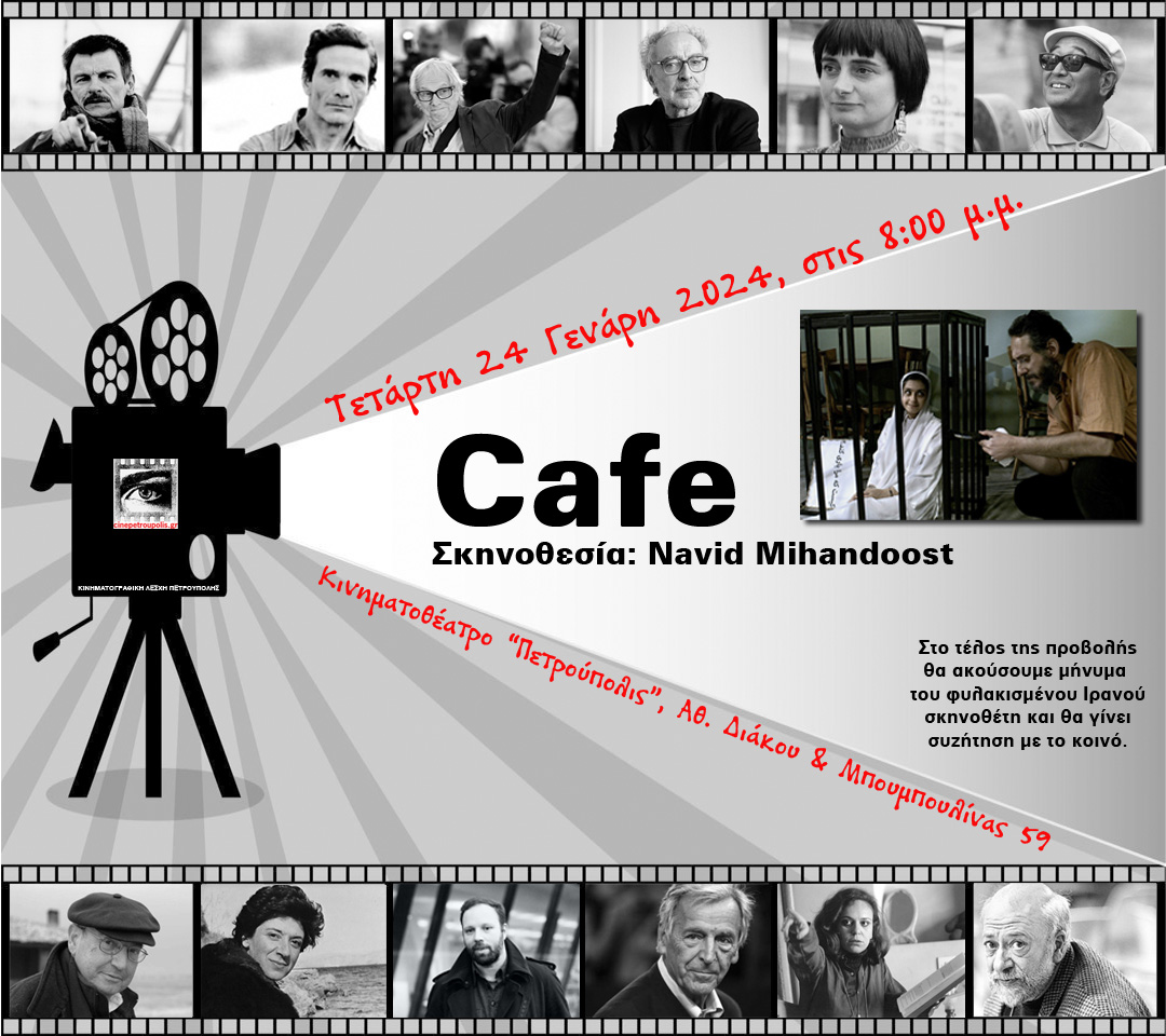 Η Κινηματογραφική Λέσχη Πετρούπολης θα προβάλει στις 24/1, στις 20:00 στο Κινηματοθέατρο «Πετρούπολις», την ταινία του Ιρανού σκηνοθέτη, Navid Mihandoost, «Καφέ». Η είσοδος είναι ελεύθερη.