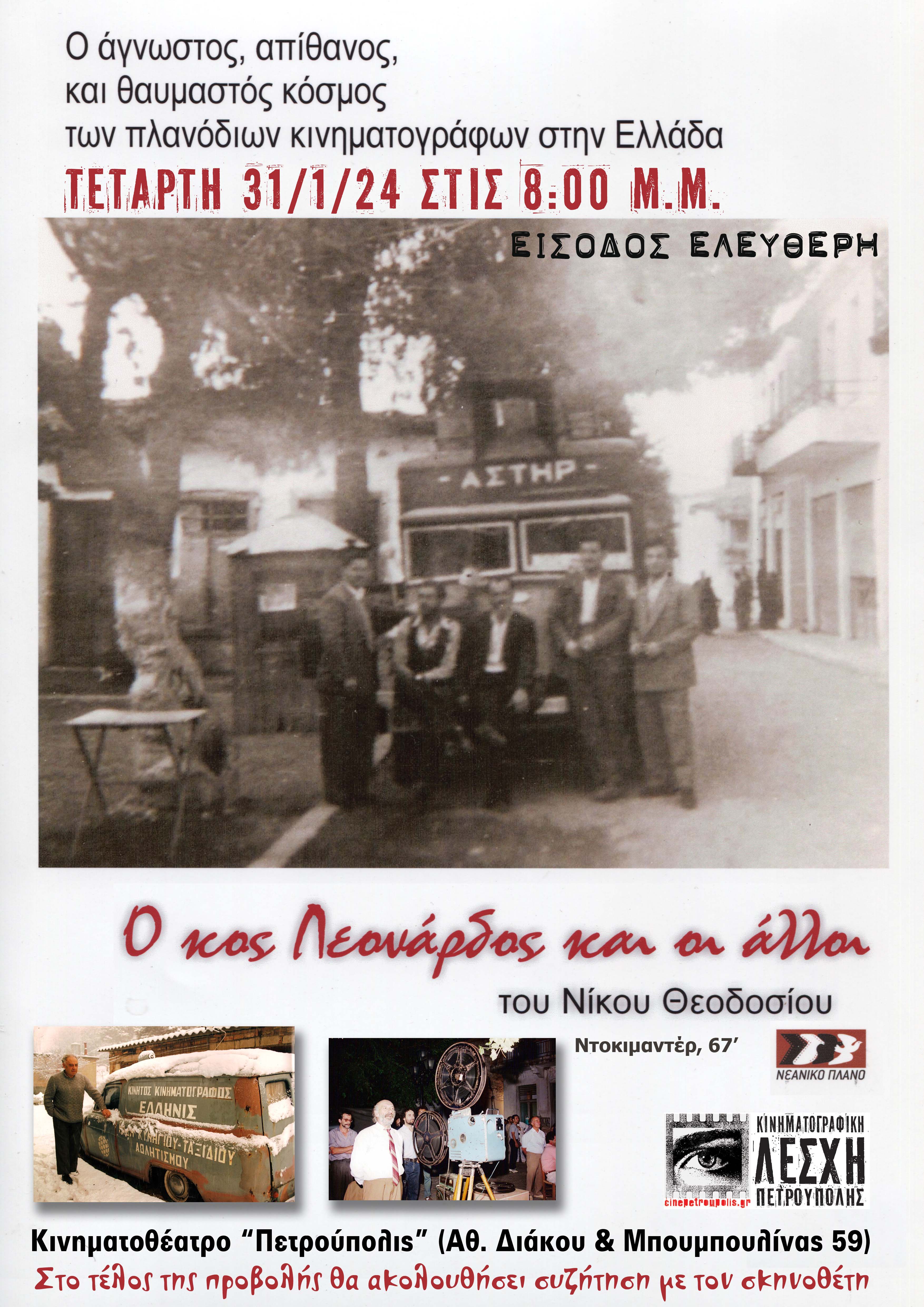 Η Κινηματογραφική Λέσχη Πετρούπολης θα προβάλει την Τετάρτη (31/1), στις 20:00 στο Κινηματοθέατρο «Πετρούπολις» (Πνευματικό Κέντρο Πετρούπολης, Μπουμπουλίνας 59 & Αθ. Διάκου), την ταινία του Νίκου Θεοδοσίου, «Ο κύριος Λεονάρδος και οι άλλοι». Η είσοδος, όπως πάντα, είναι ελεύθερη.