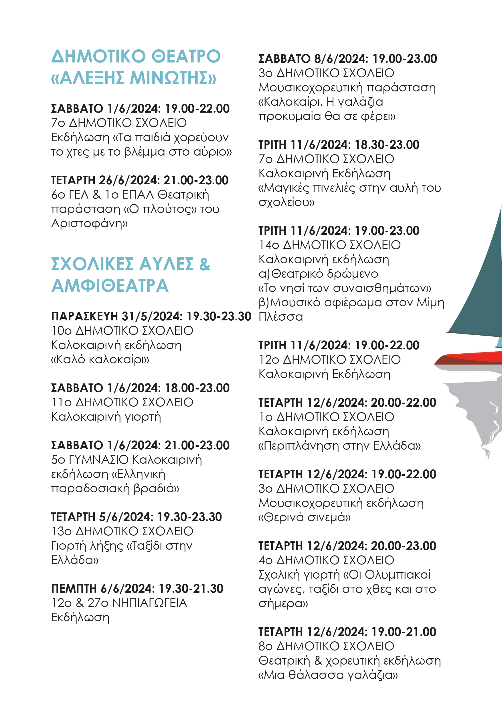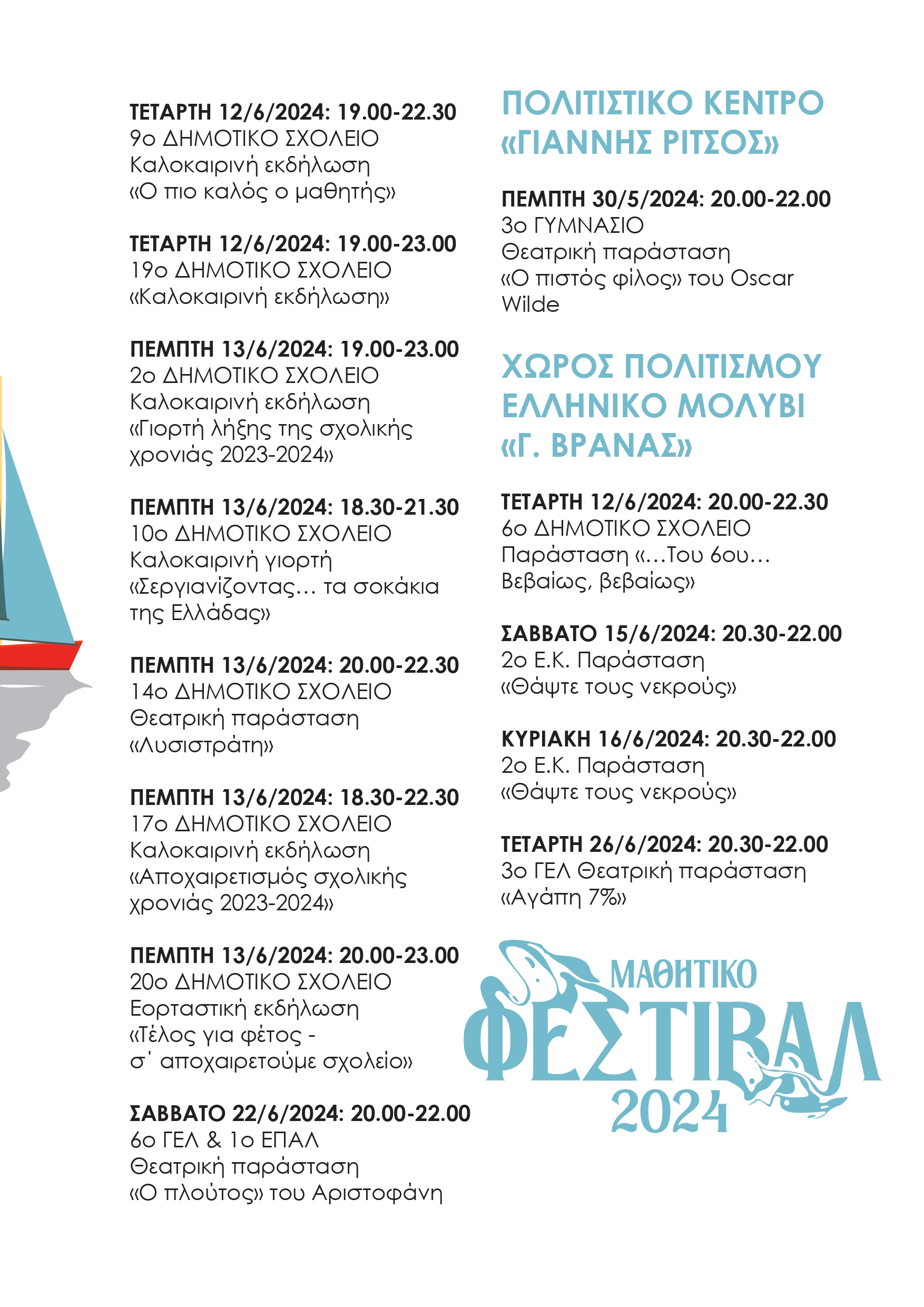 Οι μαθητές μας από τις 30 Μαΐου έως και τις 26 Ιουνίου θα παρουσιάσουν ένα πλούσιο πρόγραμμα από θεατρικές & χορευτικές παραστάσεις, καλλιτεχνικά & μουσικά δρώμενα, αλλά και εκθέσεις εικαστικών!
