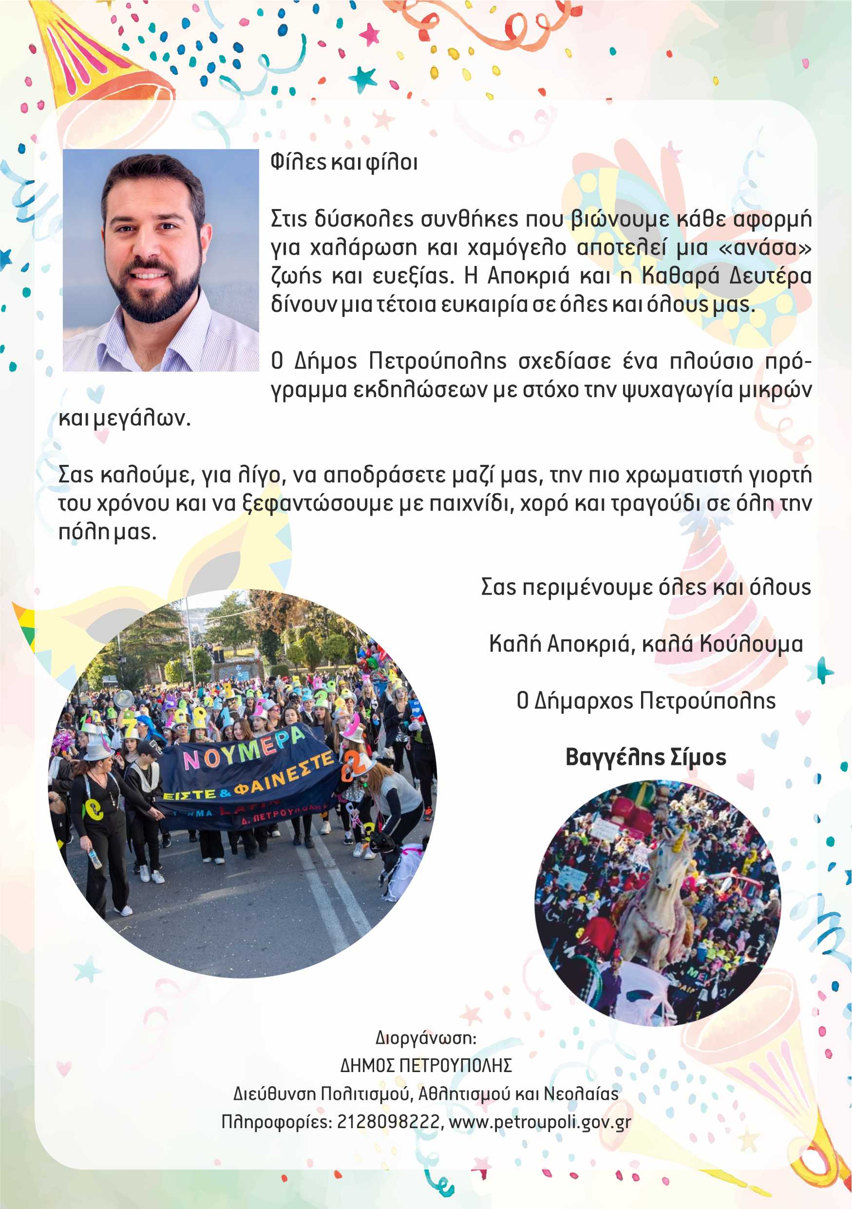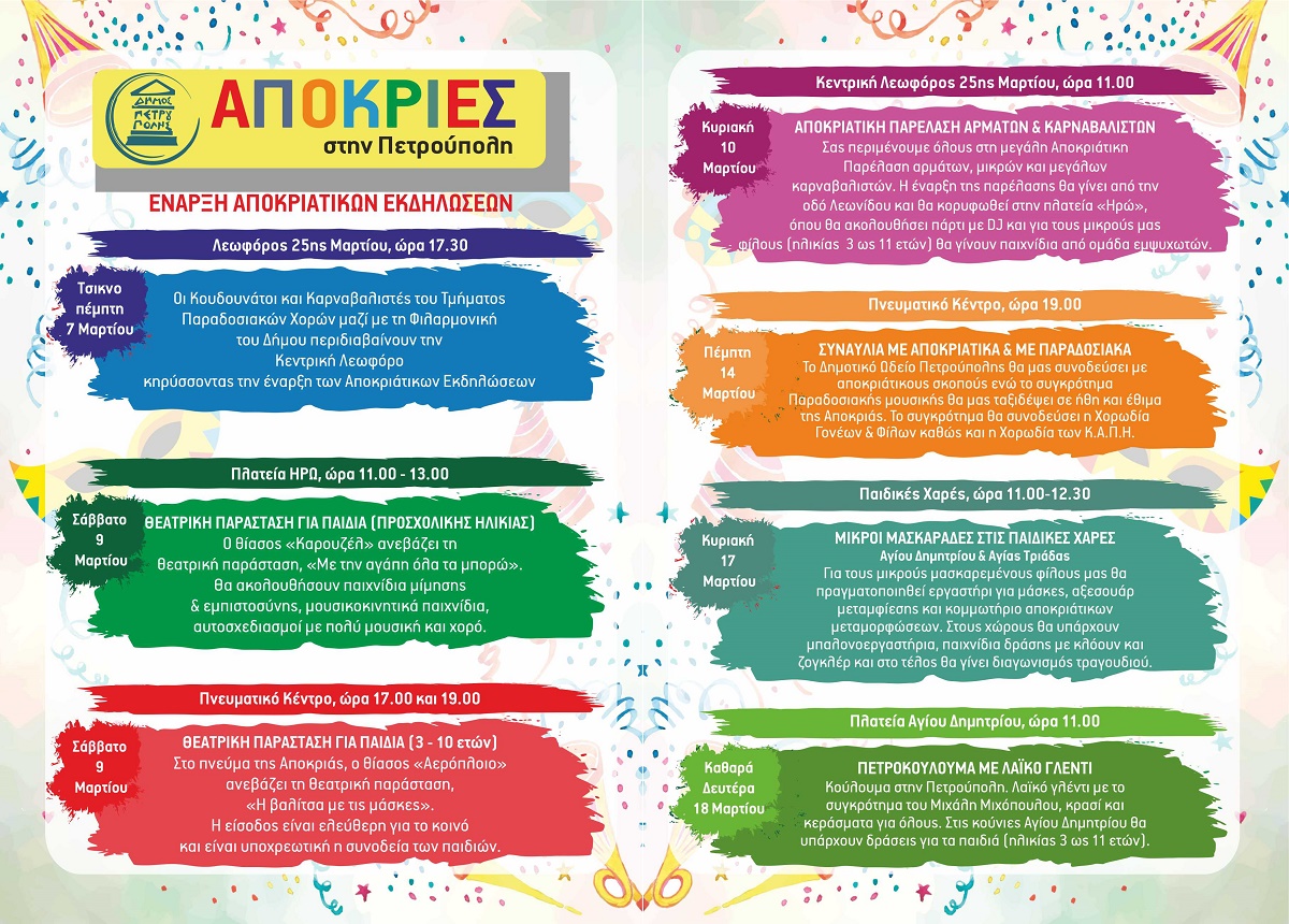 Ο Δήμος Πετρούπολης σας καλεί στις εκδηλώσεις για τον εορτασμό της Αποκριάς και της Καθαράς Δευτέρας.