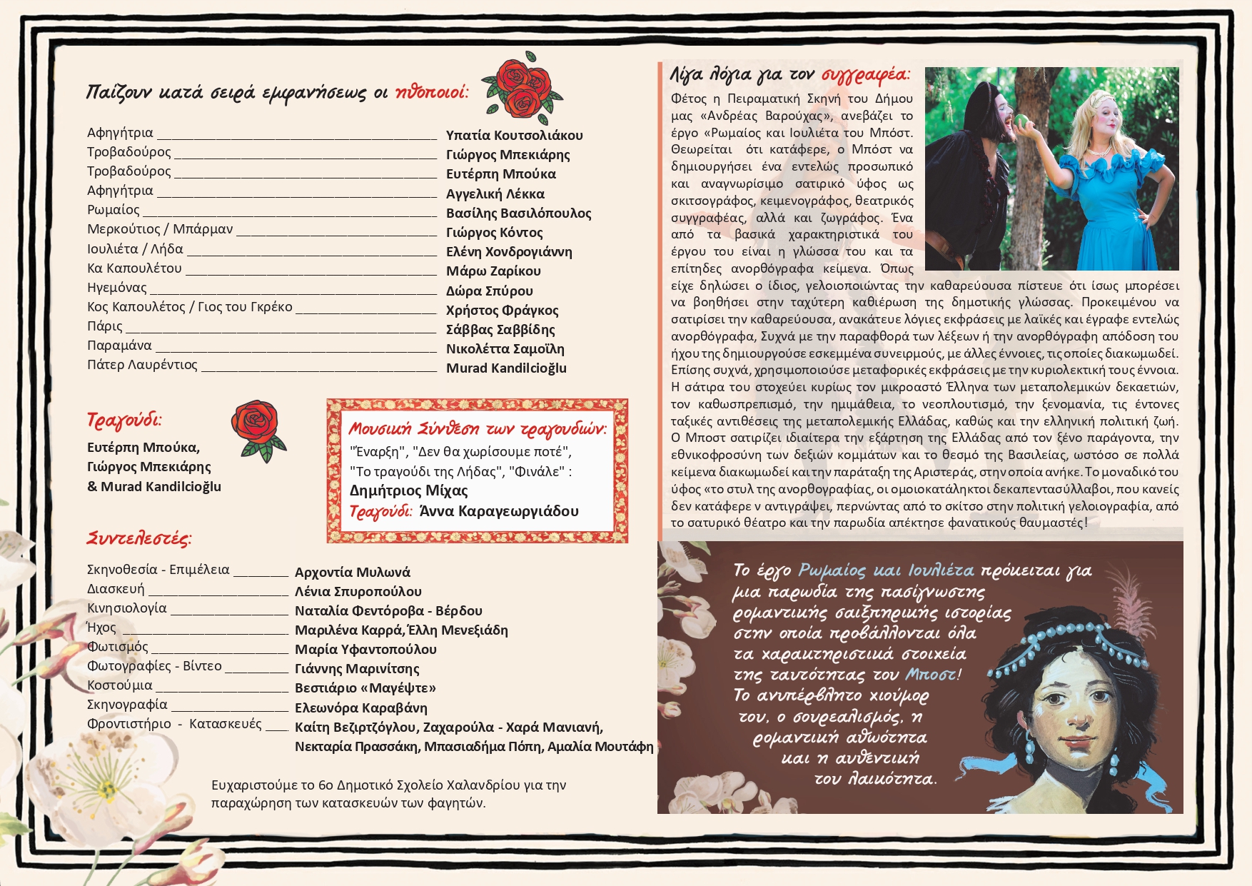 Το έργο «Ρωμαίος και Ιουλιέτα» αποτελεί μια παρωδία της πασίγνωστης ρομαντικής σαιξπηρικής ιστορίας, στην οποία προβάλλονται όλα τα χαρακτηριστικά στοιχεία της θεατρικής ταυτότητας του Μποστ! Το ανυπέρβλητο χιούμορ του, ο σουρεαλισμός, η ρομαντική αθωότητα και η αυθεντική του λαϊκότητα.