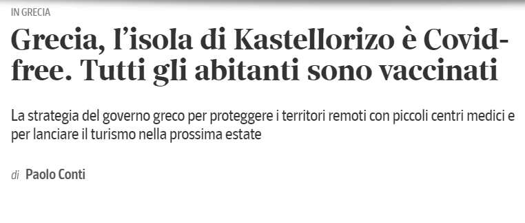Το άρθρο της έχει τίτλο «Ελλάδα, το Καστελλόριζο είναι covid free και αναφέρει πως όλοι οι κάτοικοι εμβολιάσθηκαν», σύμφωνα με τη στρατηγική της ελληνικής κυβέρνησης για να προστατέψει μικρές και απομακρυσμένες περιοχές και για να δώσει νέα ώθηση στον τουρισμό, ενόψει του καλοκαιριού». Συνεχίζει γράφοντας: «για τους κατοίκους του νησιού, ο Φλεβάρης ήταν ιστορικός μήνας, γιατί «την περασμένη Κυριακή, 21 Φεβρουαρίου ήταν από τις πρώτες περιοχές της Ελλάδας όπου χορηγήθηκε η δεύτερη δόση του εμβολίου Pfizer».