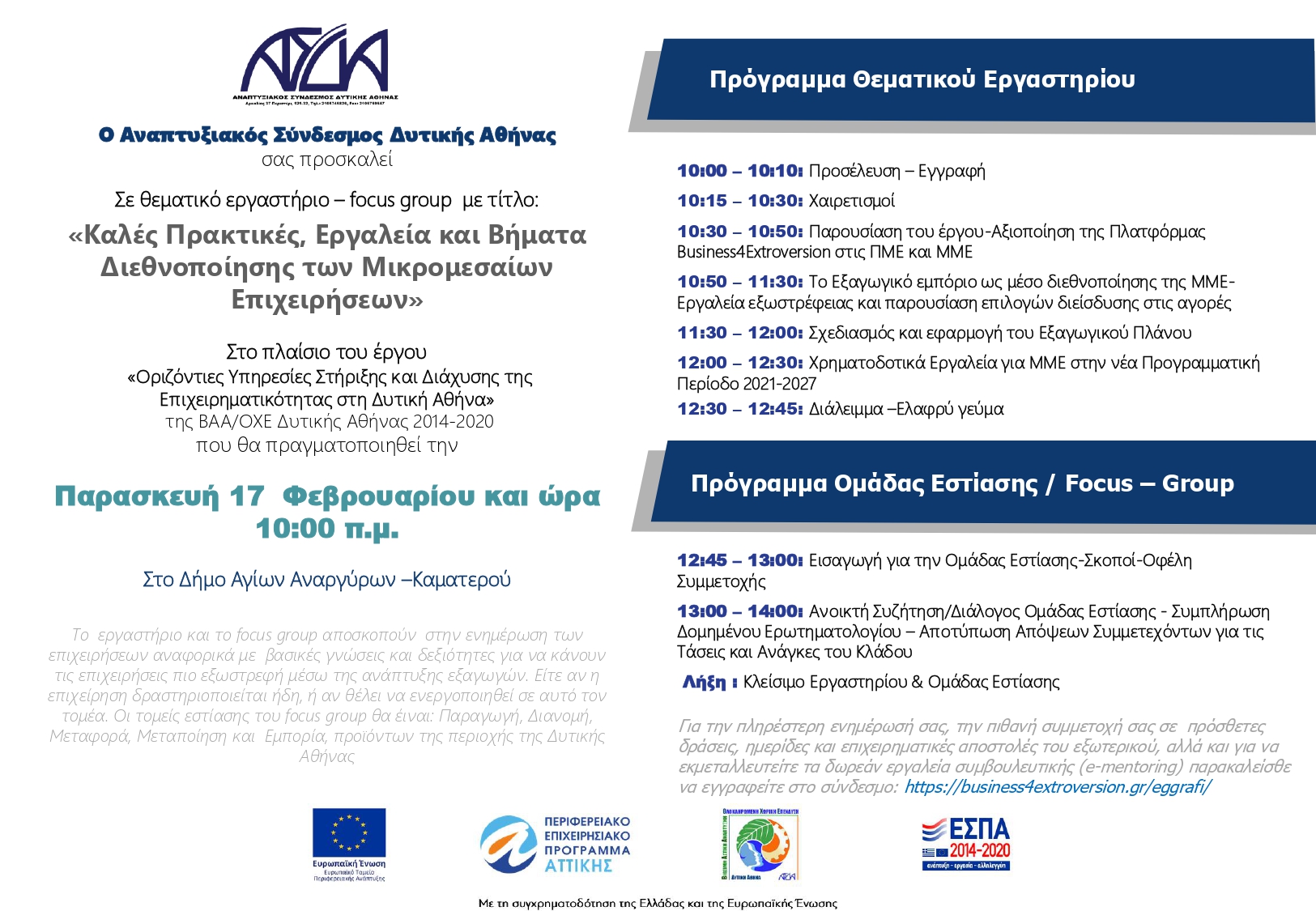 Ο Αναπτυξιακός Σύνδεσμος Δυτικής Αθήνας, στο πλαίσιο του έργου «Οριζόντιες Υπηρεσίες Στήριξης και Διάχυσης της Επιχειρηματικότητας στη Δυτική Αθήνα», διοργανώνει την Παρασκευή 17 Φεβρουαρίου 2023 και ώρα 10:00 π.μ., στο Αμφιθέατρο του Πάρκου Περιβαλλοντικής Εκπαίδευσης και Ανταποδοτικής Ανακύκλωσης του Δήμου Αγίων Αναργύρων – Καματερού, Θεματικό Εργαστήριο με θέμα «Καλές Πρακτικές, Εργαλεία και Βήματα Διεθνοποίησης των Μικρομεσαίων Επιχειρήσεων».