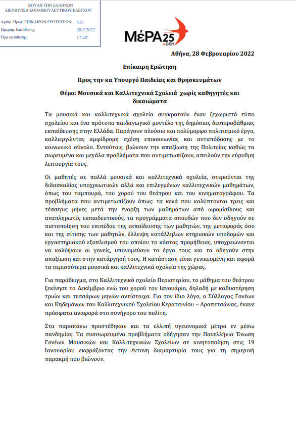 Όπως αναφέρει στην ερώτηση που κατάθεσε στη Βουλή ο Κρίτων Αρσένης, βουλευτής του ΜέΡΑ25, τα μουσικά και καλλιτεχνικά σχολεία του Περιστερίου και του Ιλίου λειτουργούν χωρίς μόνιμους καθηγητές στα παραδοσιακά μουσικά όργανα, τον κινηματογράφο και τον χορό.