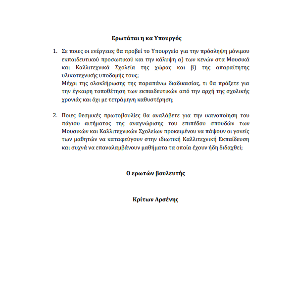 «Κάλεσα κατεπειγόντως την κ. Κεραμέως στη Βουλή ώστε να δεσμευτεί να προσλάβει μόνιμο εκπαιδευτικό προσωπικό ώστε να καλύψει τα σχολικά κενά αλλά και να μας ενημερώσει για το αν σκοπεύει να αναγνωρίσει το επίπεδο σπουδών αυτών των σχολείων ώστε να μην ωθούνται οι μαθητές στην Ιδιωτική Καλλιτεχνική Εκπαίδευση», λέει ο κ. Αρσένης που περιμένει την απάντηση στη Βουλή της υπουργού Παιδείας.