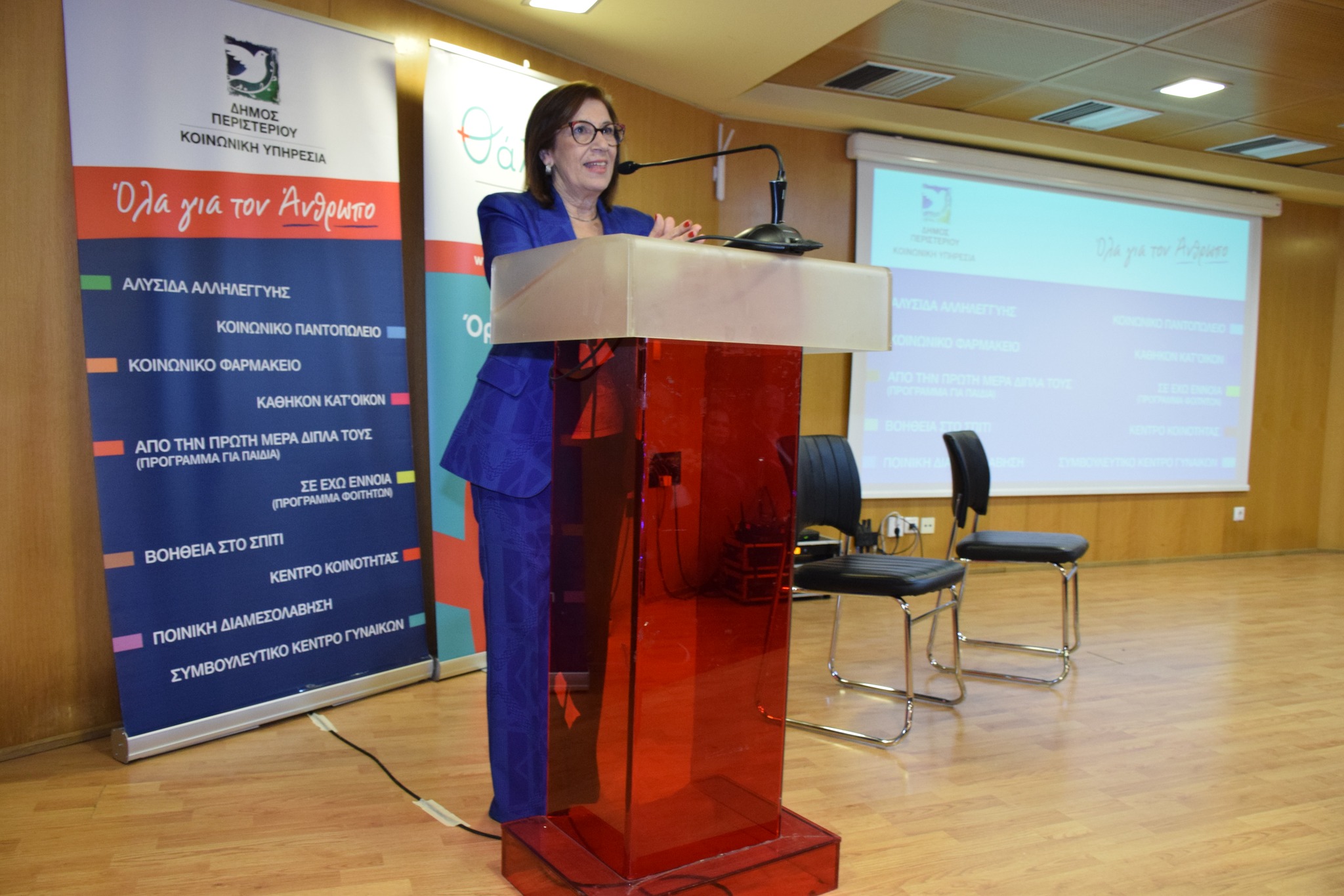 Υπάρχει το Κέντρο Κοινότητος, μια δομή της Κοινωνικής υπηρεσίας που είναι χρηματοδοτούμενη από το ΕΣΠΑ και βοηθά όποιον δεν μπορεί να καταφέρει στην καθημερινότητά του πράγματα όπως η διεκπεραίωση χαρτιών, αιτήσεις συντάξεων, συντάξεων αναπηρίας, τα πάντα. Έχουμε προγράμματα όπως το πρόγραμμα «Στέγαση και Εργασία για τους αστέγους», στο οποίο οι ωφελούμενοι υπάγονται (παρουσιάζοντας βέβαια τα απαραίτητα δικαιολογητικά) και τους βοηθάμε να βρουν δουλειά και συγχρόνως να νοικιάσουν ένα σπίτι για τρία χρόνια δωρεάν. Βέβαια, εδώ υπάρχει ένα μικρό πρόβλημα γιατί δεν υπάρχουν πολλά διαθέσιμα σπίτια και παρατηρείται καθυστέρηση. Έχουμε επίσης το «Συμβουλευτικό Κέντρο Γυναικών» που εξυπηρετεί καθημερινά, με 4 επιστήμονες, όχι μόνο δημότες και κυρίως δημότισσες Περιστερίου αλλά και άλλων δήμων. Ειδικά όταν εμφανίζεται κάτι έκτακτο και επείγον, λειτουργεί σε επικοινωνία και συνεργασία με ένα από τα 40 και πλέον συμβουλευτικά κέντρα που υπάρχουν, μαζί με 16 ξενώνες, για την άμεση αντιμετώπιση του συμβάντος. Τέτοιες καταστάσεις μπορεί να αφορούν ενδοοικογενειακή βία και έχουμε την αμεσότητα παροχής συμβουλευτικών υπηρεσιών, με ψυχολόγο και νομικό, για παροχή συμβουλών και καθοδήγηση. Επιπλέον έχει ιδρυθεί μια επιτροπή που ασχολείται με την ενδοσχολική βία και κάθε πρόβλημα που ανακύπτει μέσα στα σχολεία ανακοινώνεται στους ειδικούς μας και γίνεται η αντίστοιχη έρευνα και συμβουλευτική. Να επισημάνω ότι έχουμε νομική και ψυχολογική υποστήριξη στους θύτες και όχι στα θύματα, κάτι που είναι πρωτοποριακό και είμαστε ο μοναδικός δήμος σε όλη την Αττική που το κάνει αυτό. Είναι πολύ ουσιώδες, γιατί παρακολουθούνται οι θύτες για τις συμπεριφορές τους και γίνονται συνεδρίες για τους θύτες. Γενικά άνθρωποι που ζουν κάτω από το φάσμα της φτώχειας και των ψυχικών παθήσεων, μοναχικοί άνθρωποι άρρωστοι, που δεν έχουν κανέναν, καταστάσεις τραγικές, αντιμετωπίζονται από τη δική μας υπηρεσία, προσπαθούμε να κάνουμε το καλύτερο δυνατό και νομίζω ότι το καταφέρνουμε.