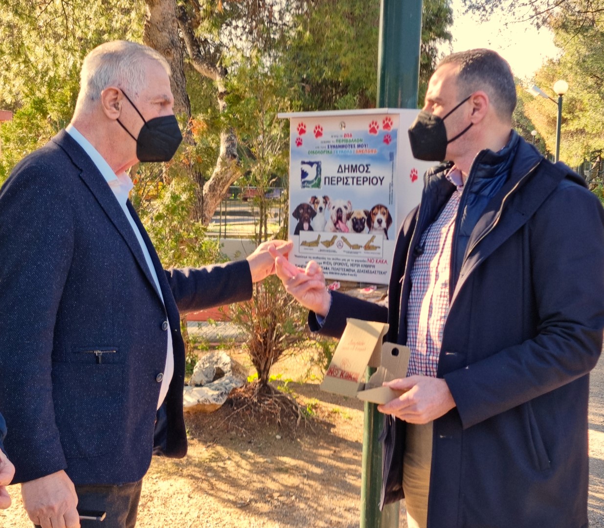 Ο Δήμος Περιστερίου χρηματοδότησε μία ιδιαίτερη κα πρωτότυπη πρωτοβουλία για τους ιδιοκτήτες σκύλων και όχι μόνο. Το «ΝΟ ΚΑΚΑ» είναι μια ελληνική πατέντα και πρόκειται για ένα χάρτινο φαράσι μιας χρήσης ανακυκλώσιμο, ανακυκλωμένο και φιλικό στο περιβάλλον και εύκολο στη χρήση του. Με αυτό ο συνοδός του σκύλου μπορεί να μαζέψει πολύ εύκολα τις ακαθαρσίες και να τις πετάξει. Ο υπεύθυνος γι’ αυτή την πρωτοβουλία, Αντιδήμαρχος κ.Θεοδωράκος μας είπε ότι ο στόχος του συγκεκριμένου εγχειρήματος δεν αφορά μόνο τα δεσποζόμενα αλλά και τα αδέσποτα σκυλιά, αφού ο καθένας μπορεί να μαζέψει ακαθαρσίες ακόμα και αδέσποτων σκύλων, συμβάλλοντας έτσι, όπως χαρακτηριστικά τόνισε ο ίδιος «στην ευαισθητοποίηση του πολίτη, γιατί η καθαριότητα των κοινόχρηστων χώρων συντελεί στην αναβάθμιση όλου του αστικού περιβάλλοντος, με σεβασμό στον συνάνθρωπο και τον πολίτη».