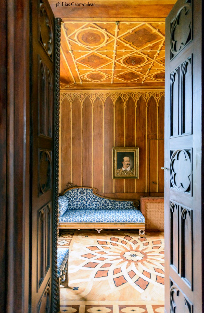 «Η έντονα κυανή ατμόσφαιρα των τοίχων και της οροφής με τη χρυσή γεωμετρική διακόσμηση, το ξύλινο πάτωμα από διαφορετικά είδη ξύλου στα πρότυπα της σχολής του Μονάχου, ο χρυσοποίκιλτος και έντονα χρωματικός σε μπλε και κόκκινες ζώνες διάκοσμος, τα μικροέπιπλα και τα φωτιστικά σε καθαρά γοτθικό ρυθμό, αναδεικνύουν τη βούληση της Αμαλίας να προβάλει μια ρομαντική διακοσμητική τάση».