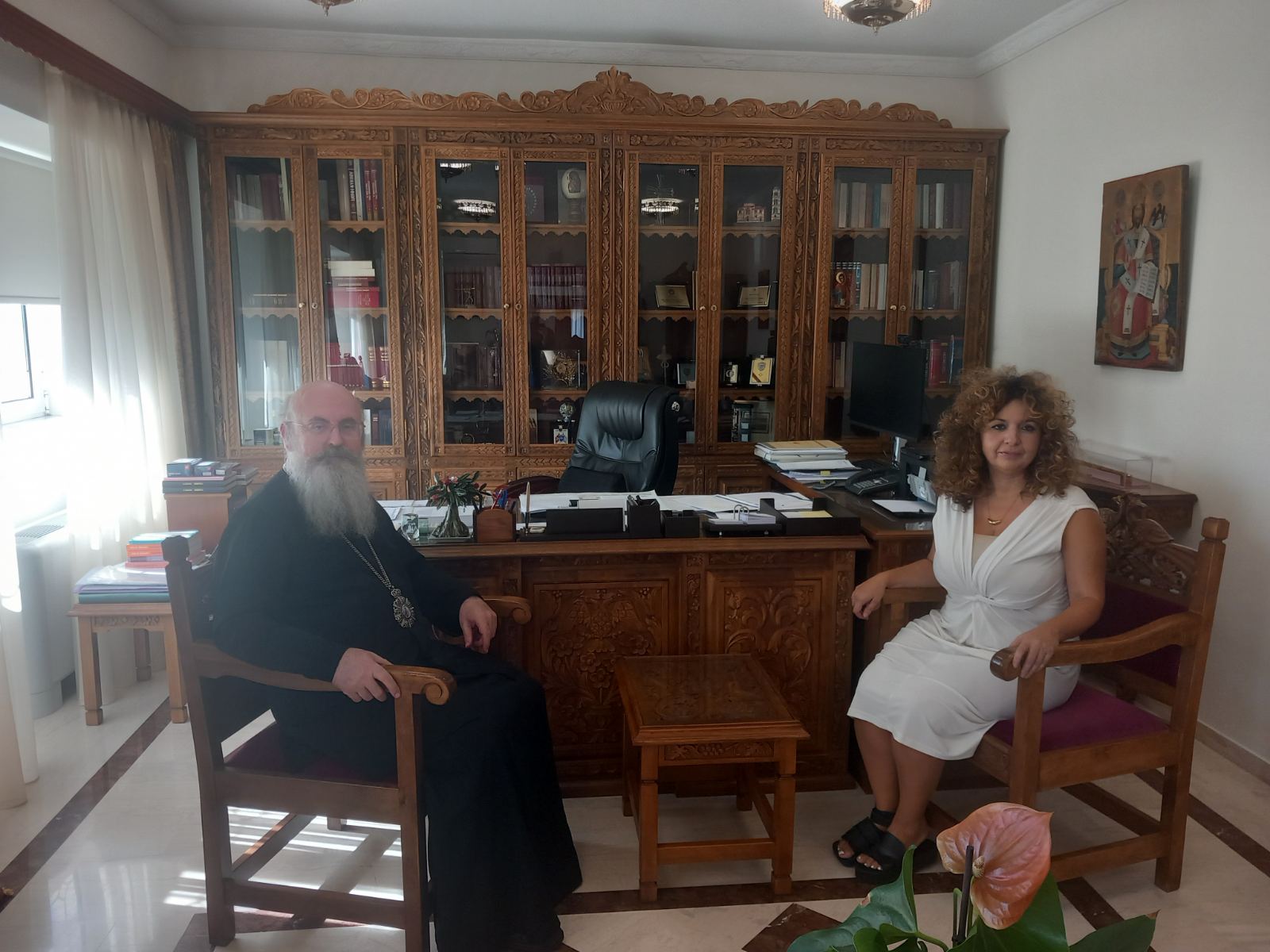 Εξάλλου δεν πήγα τυπικά με συγκεκριμένες ερωτήσεις και καθορισμένο πλάνο αλλά με ουσιαστικό ενδιαφέρον και περιέργεια, θα έλεγα, για αυτή την ιδιαίτερη προσωπικότητα που μετά από λαμπρές σπουδές και με αναγνωρισμένη σταδιοδρομία σε ακαδημαϊκό επίπεδο που δεν έχει εγκαταλείψει, βρέθηκε στο ανώτατο εκκλησιαστικό αξίωμα του δήμου μου. Μια θέση στην οποία εκτίθεται, με αποτέλεσμα άλλοτε να εγκωμιάζεται, κάποιες φορές να επικρίνεται αλλά πάντα να τηρεί μια στάση δυναμικής ταπεινότητας και αξιοπρέπειας. Η επίσκεψή μου στη Μητρόπολη Περιστερίου, για πρώτη φορά ομολογώ, αποτέλεσε μια ευχάριστη έκπληξη αφού από τον ιερέα που με υποδέχτηκε στην είσοδο μέχρι τον Σεβασμιότατο που με καλωσόρισε στο γραφείο του, βρήκα βλέμματα και λόγια ευγένειας και καλοσύνης. Στον Μητροπολίτη Γρηγόριο βέβαια, οφείλω να ομολογήσω, πως διέκρινα τη βαθιά γνώση των εκκλησιαστικών κειμένων, τον εμπεριστατωμένο λόγο και την οξεία κρίση που δικαιολογούν τους τίτλους και τις διακρίσεις που τον συνοδεύουν. Επειδή όμως η Εκκλησία δε χρειάζεται εγκώμια και είμαι η τελευταία που θα το έκανε, αφού η αμφισβήτηση κάποιων θεσμών είναι αναγκαία προϋπόθεση της σκέψης μου, χωρίς αυτό να σημαίνει άρνηση αλλά κριτική σκέψη απέναντι σε κάθε δογματισμό, θα προσπαθήσω, αδέξια ίσως, να μεταφέρω μέσω του γραπτού λόγου μια ενδιαφέρουσα συζήτηση, τουλάχιστον για εμένα.